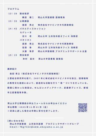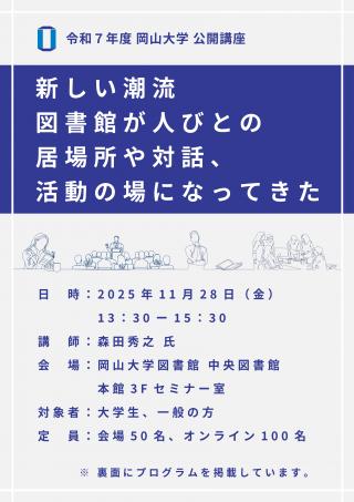 岡山大学公開講座「新しい潮流 図書館が人びとの居場所や対話、活動の場になってきた」開催のお知らせ(2025.11.28)