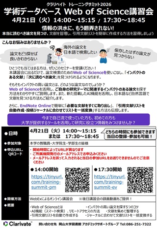 「Web of Science」等のクラリベイト・アナリティクス社によるオンライン講習会が開催されます。